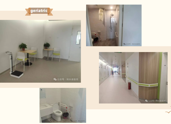 适老化设计。病房内配备防滑地板、扶手栏杆、可调节高度的病床与座椅,卫生间加装紧急呼叫按钮,减少跌倒风险;走廊光线柔和明亮,避免强光刺激,标识清晰易懂,方便老人识别方向。